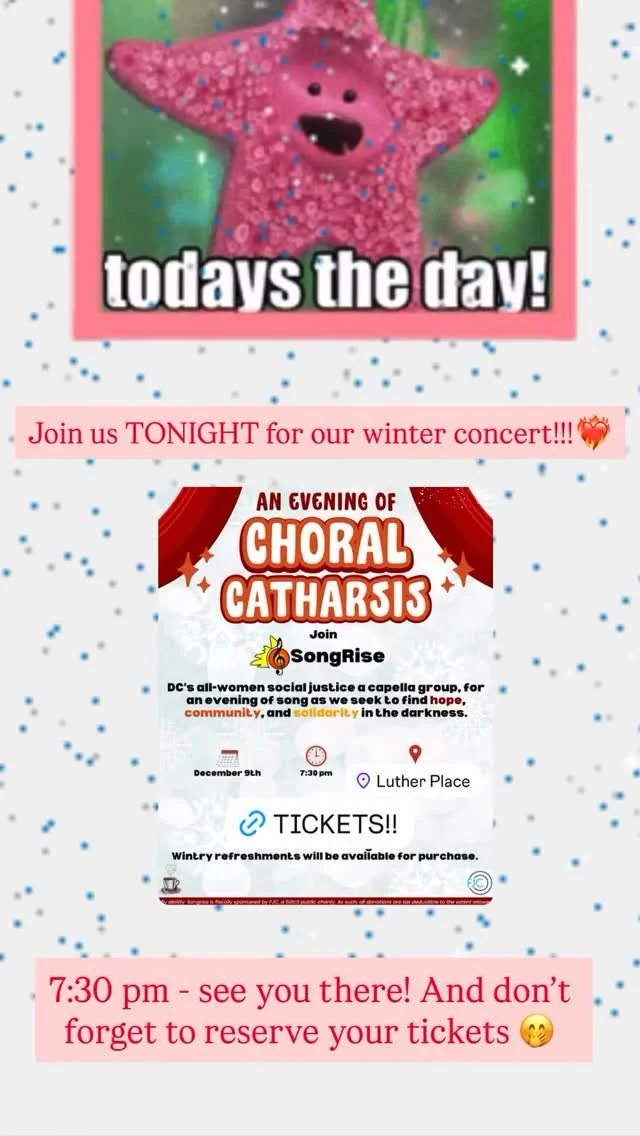 SongRise invites you to join us for our fall fundraiser concert, An Evening of Choral Catharsis, on Tuesday, December 9th at 7:30 pm at Luther Place Memorial Church in Washington, DC. 2025 has brought numerous challenges to the city we call home, from federal workforce layoffs to national guard deployment to immigration raids. As we close out the year, SongRise invites you to gather with us for an evening of music as we seek to find hope, community and solidarity in the darkness. We encourage you to pre-register for concert tickets below, but also welcome day-of walk-ins.